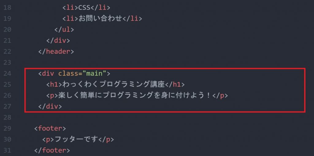 上の画像のように、index.htmlファイルのbody内にあるmainレイアウトの中にh1とpを記述しました。両方の文章に含まれる「プログラミング」という文字だけにスタイルを指定してみます。