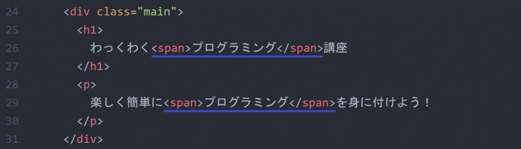 単純にスタイルを適用したい文字をspan要素で囲みます。今回の場合「プログラミング」という文字です。後はCSSでスタイルを指定するだけです。