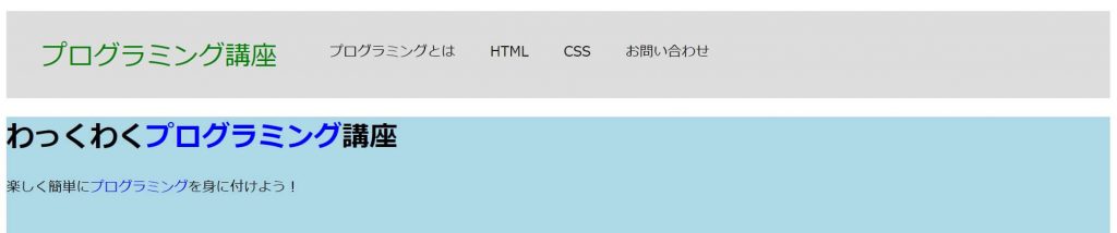 指定した通り「プログラミング」という文字だけが青色になっているのを確認できます。今回はspan要素全体にスタイルを指定したので、h1もpも同じスタイル(文字色:青白)になりました。