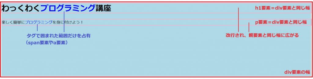 上の画像では、ブロックレベル要素を赤字、インライン要素を青字で示しています。
