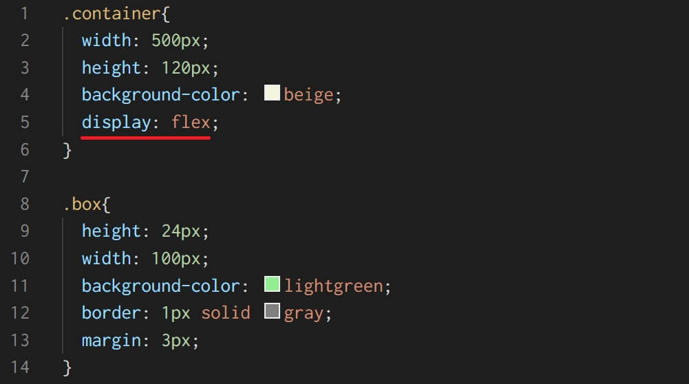 では、container全体に指定されているdisplay: flex;に、flex-directionを組み合わせて挙動を確認していきます。