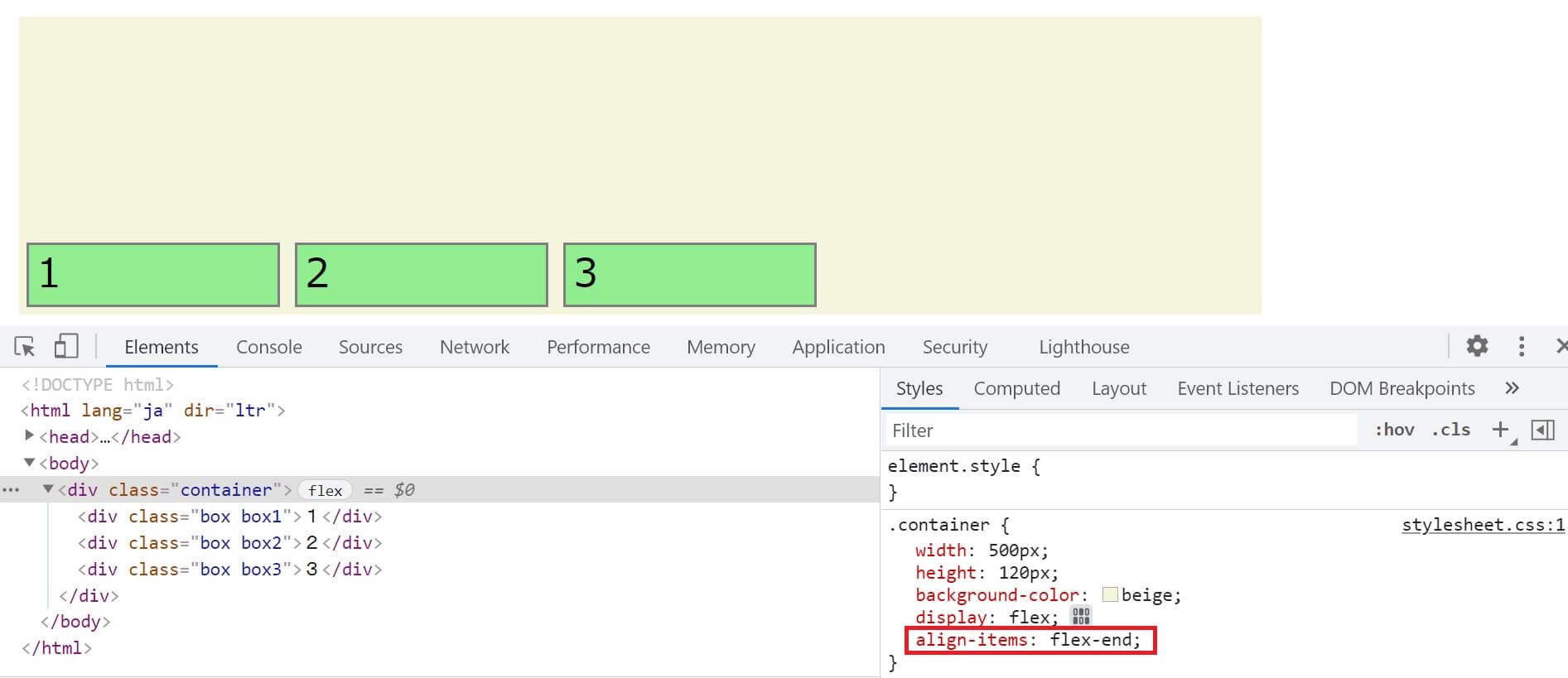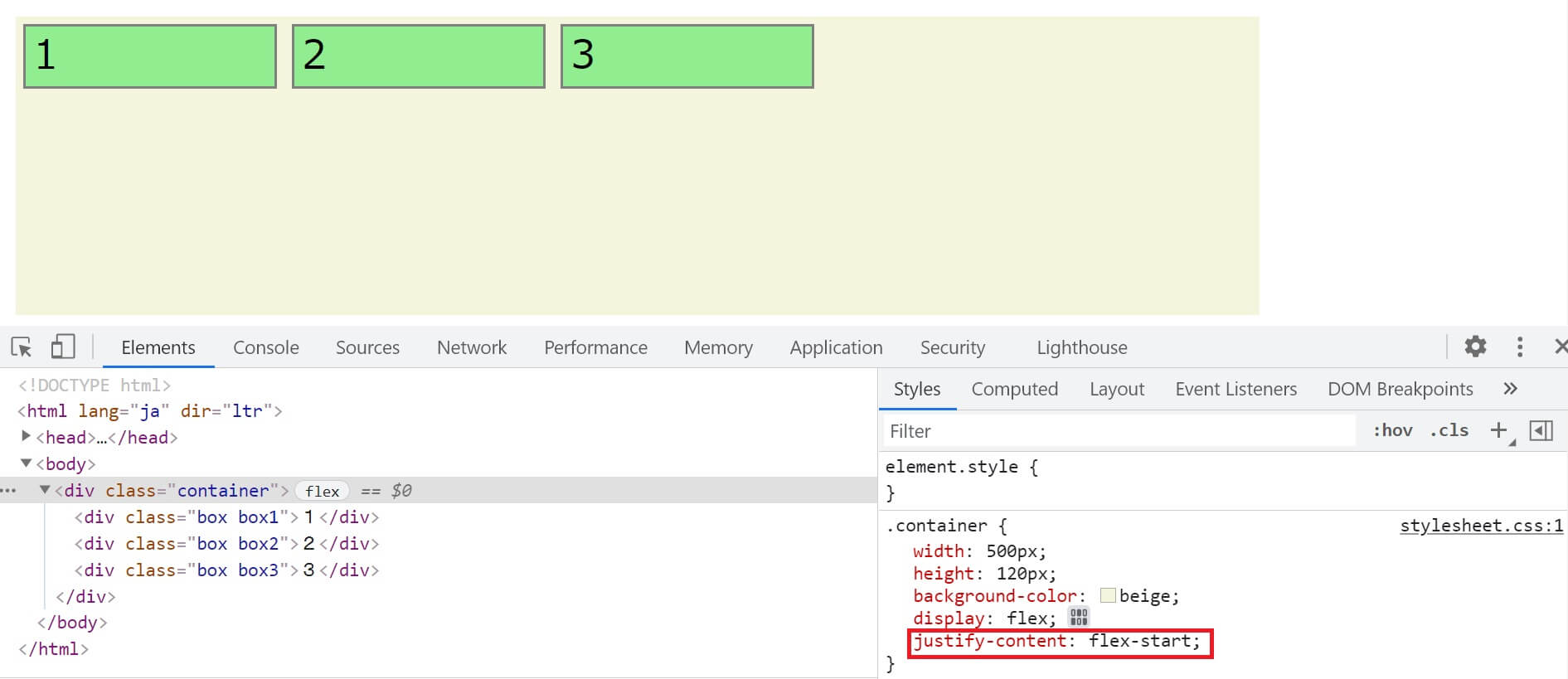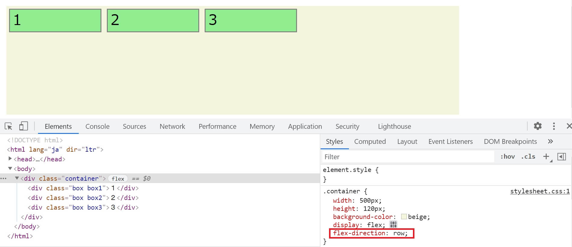 開発者ツールで確認すると分かりやすいと思います。CSSでflex-direction: row;が指定されています。デフォルトで主軸は横(水平)になっています。それで、横を意味するrowを指定しても変化はありません。container内の3つのboxは横方向へ左から順に並んでいます。