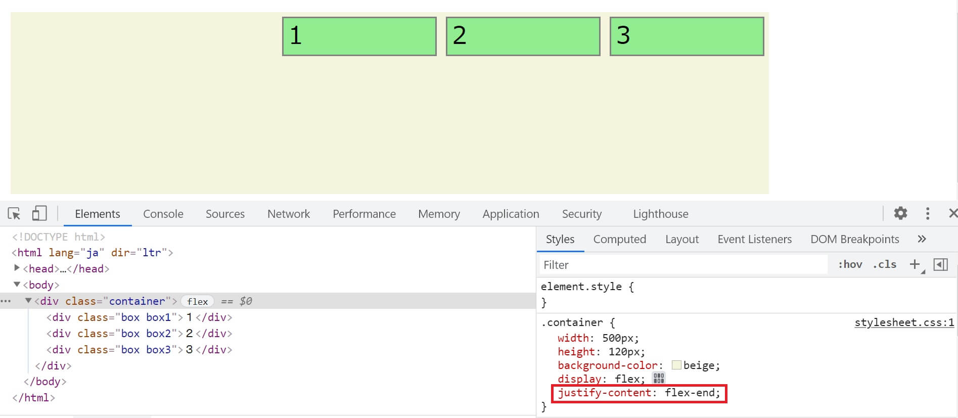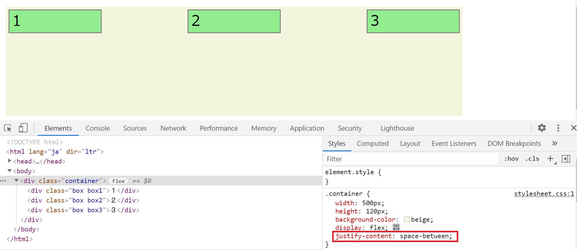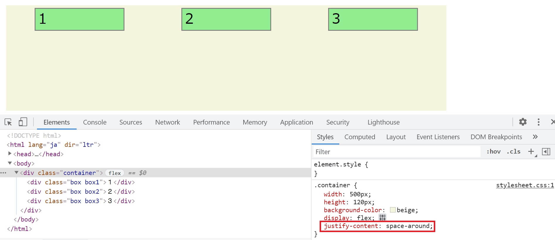 最初に準備したHTMLとCSSを使います。containerに対してdisplay: flex;とjustify-contentを組み合わせた時の挙動です。