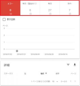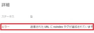 「エラー」項目に表示されるURLはインデックス登録されていません。「エラー」をクリックして、インデックス登録エラーが急激に増えていないか定期的に確認することは大切なことです。エラーがある場合、「詳細」欄にその内容が表示されます。