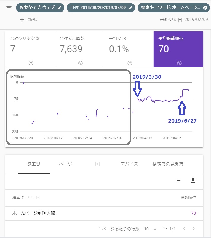 そして、ようやく2019年3月30日からは安定して75位前後にランクされています。グーグルの評価が定まるのに7か月がかかりました。