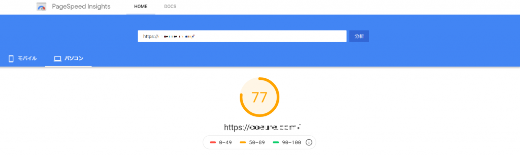 URLを入力して「分析」すると、以下のような結果が出ます。PSIを使えば、分析結果として「改善できる項目」や「診断」結果がわかるので役立ちます。また、パソコンとモバイル両方の数値が出るので助かります。画像では、パソコンでのスピードが77となっており、平均(オレンジ色)として表示されています。