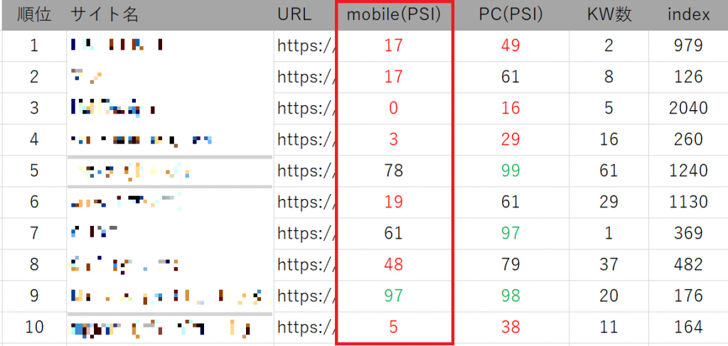 なんと上位10サイト中6ページが、PSIのモバイルでのスピードテストで20以下(遅い)という評価でした。上位4サイトがいずれも低い数字であることも注目できます。