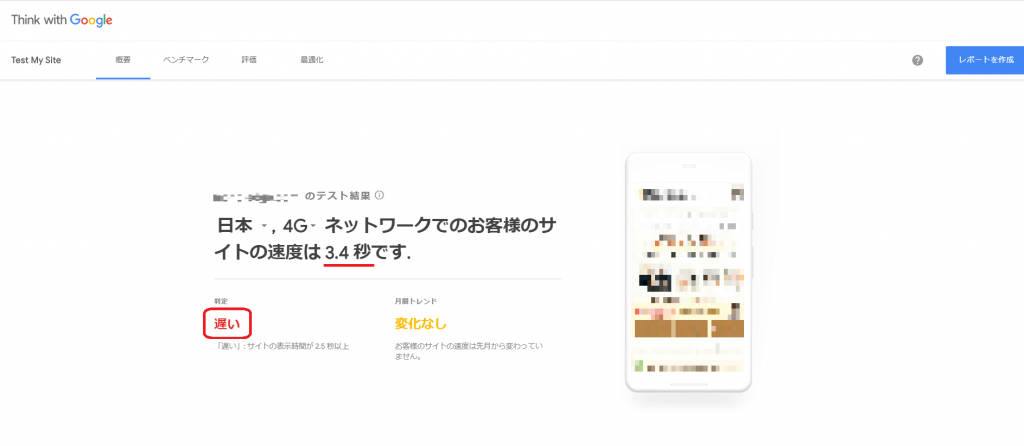画像のように、3.4秒で「遅い」と判定されます。ちなみに、PageSpeed Insightsではモバイルのスピードが90以上のサイトです。1秒台でも「平均」ですから、かなり厳しめの判定という印象です。