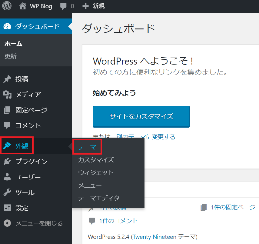 左メニューより、「外観」 >「テーマ」 を選択します。