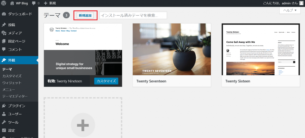 「テーマ」の画面に遷移します。画像では、既にインストールされている(ワードプレスのインストール時に自動でインストールされた)テーマが表示されています。他のテーマをインストールする場合は、上部にある「新規作成」をクリックします。