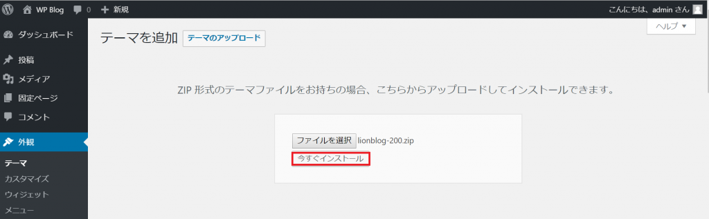 選択したファイル名が「ファイルを選択」の右横に表示されていることを確認し、「今すぐインストール」をクリックします。