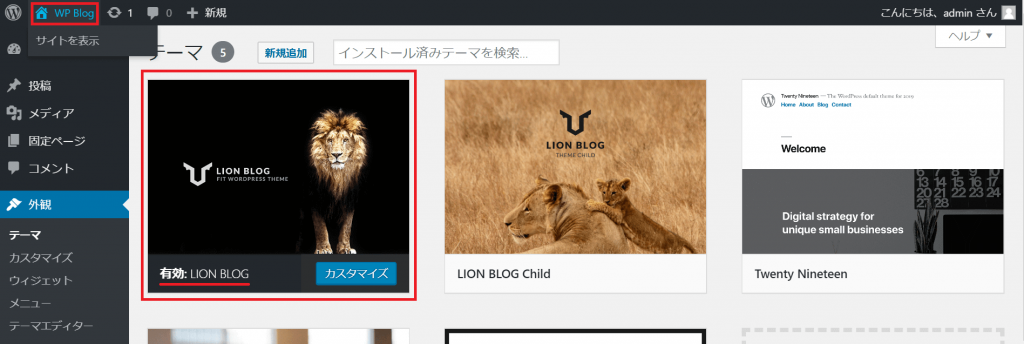 「LION BLOG」が「有効」になっていることが分かります。ホームを選択し、実際にサイトを確認してみます。