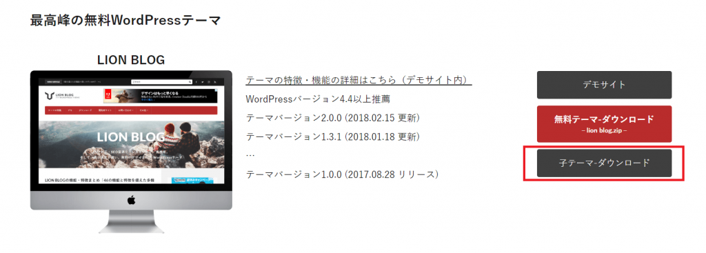 先程インストールした「LION BLOG」で考えてみましょう。「LION BLOG」(親テーマ)だけでなく「LION BLOG Child」(子テーマ)の2種類があります。実際ダウンロードページで、両方ダウンロードできるようになっています。