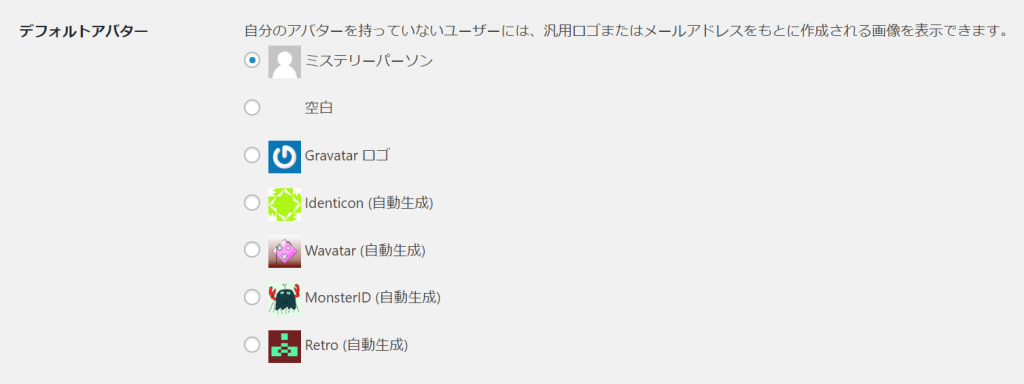 WordPressが提供しているサービス(画像のGravatar[グラバター]など)やプラグインを使用する方法もありますので、後からお好みで設定することも可能です。