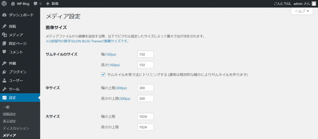 ここでは、画像をアップロードする際の画像サイズの設定ができます。最初はデフォルトのままでOKですので飛ばしましょう。