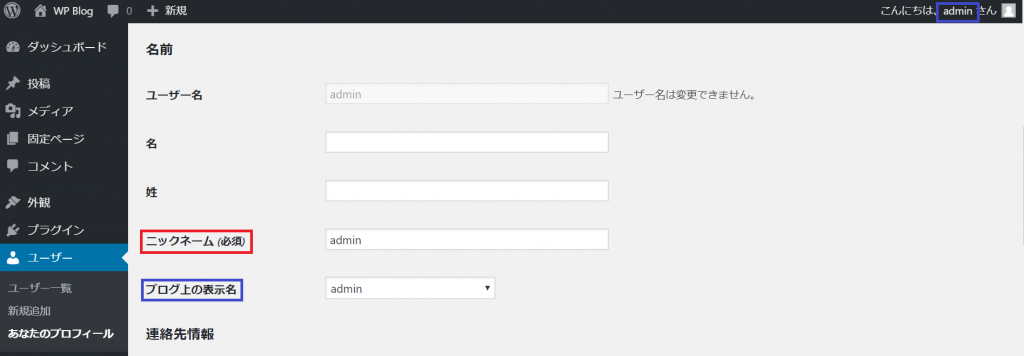画像のように、デフォルトでは「ユーザー名」が「ニックネーム(必須)」と「ブログ上の表示名」に入っています。この状態ですと、ログイン時の「ユーザー名」を公に晒しているのと同じです。セキュリティー上問題ですので、任意の「ニックネーム」を設定し、「ブログ上の表示名」はプルダウンから「ニックネーム」を選択しておきましょう。
