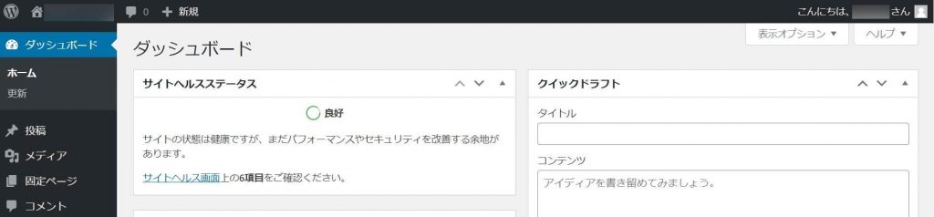 ログインできると、画像のように管理画面に入ります。WordPressでこの管理画面は「ダッシュボード」と呼ばれています。ブログ記事を投稿したりページを作成するには、このダッシュボードから操作します。