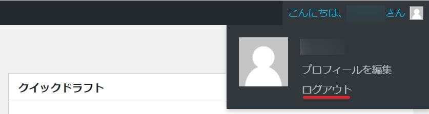 画像のように、ダッシュボード右上にあるユーザー名をクリックすると「ログアウト」を選択できます。ログイン画面に戻り、「ログアウトしました」と表示されます。この状態でサイトURLにアクセスすると、管理バーが消えた一般に公開されるサイトが表示されます。ダッシュボードには入れません。