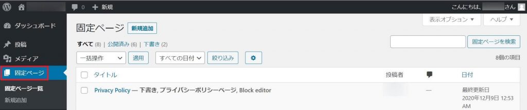 最初から、親切に?? Privacy Policyページなどのページができています。新しいページを追加したい場合は、ナビゲーションメニュー > 固定ページ > 新規追加 から行います。