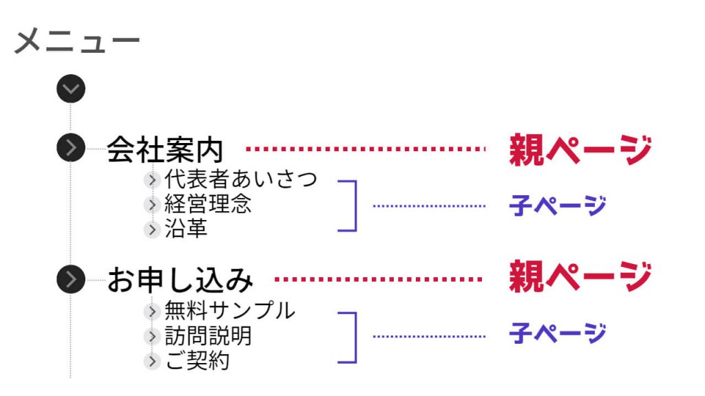 例えば、上図のように「会社案内」という親ページに、「代表者あいさつ」「経営理念」「沿革」などの子ページを設定することができます。