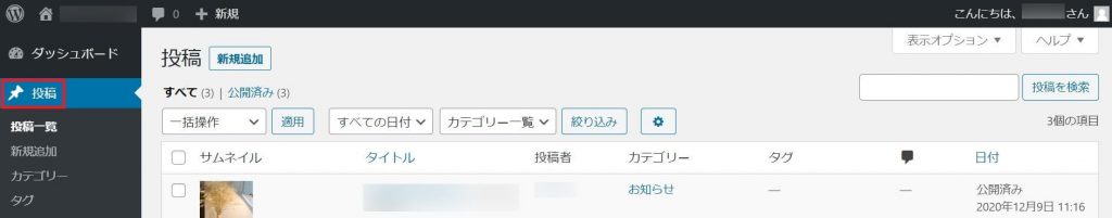 ダッシュボードのナビゲーションメニューの「投稿」で管理します。