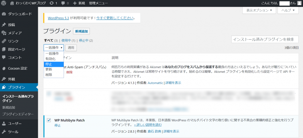 プラグインにチェックを入れ「一括操作」のプルダウンから「停止」を選択します。最後に右横にある「適用」をクリックすればプラグインの停止完了です。