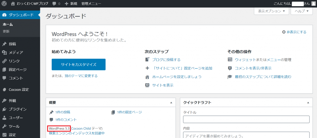ダッシュボードのホームから「概要」を見ると、画像(赤囲み)のよに最新バージョンになっていることを確認できます。