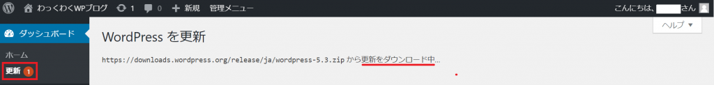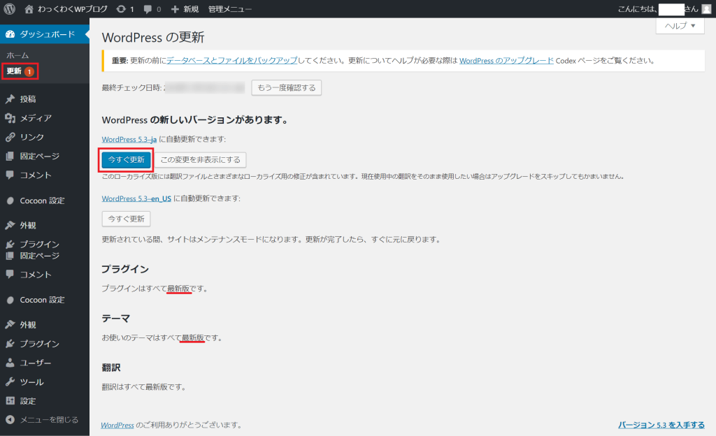 更新画面に遷移します。左メニューにある通り「更新①」(WordPressのバージョンのアップデート)があることが分かります。更新前にプラグインやテーマも最新版にしておいてください。