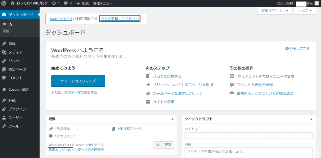 画像のように、「今すぐ更新してください」の部分をクリックします。左下にある「概要」には、現在のバージョン(WordPress5.2.4)が表示されています。