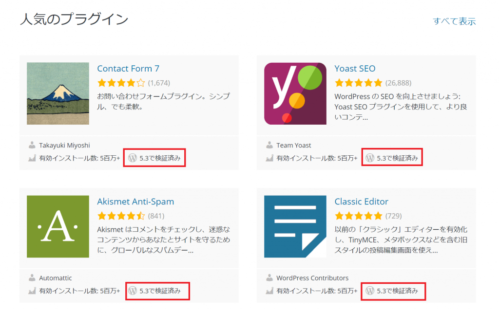 プラグインそのものがWordPressのバージョンに対応していないこともあります。バージョンアップ直後は特にそうです。大抵はプラグイン開発者が数日のうちに検証し、プラグインのバージョンアップを行ってくれます。WORDPRESS.ORGのプラグインからインストール済みのプラグインが新しいバージョンで「検証済み」かどうかを確認してみましょう。