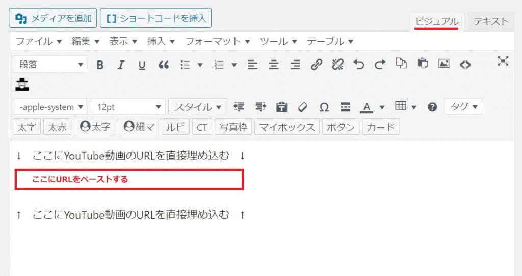 ビジュアルエディタで、コピーしたURLを貼り付けます。