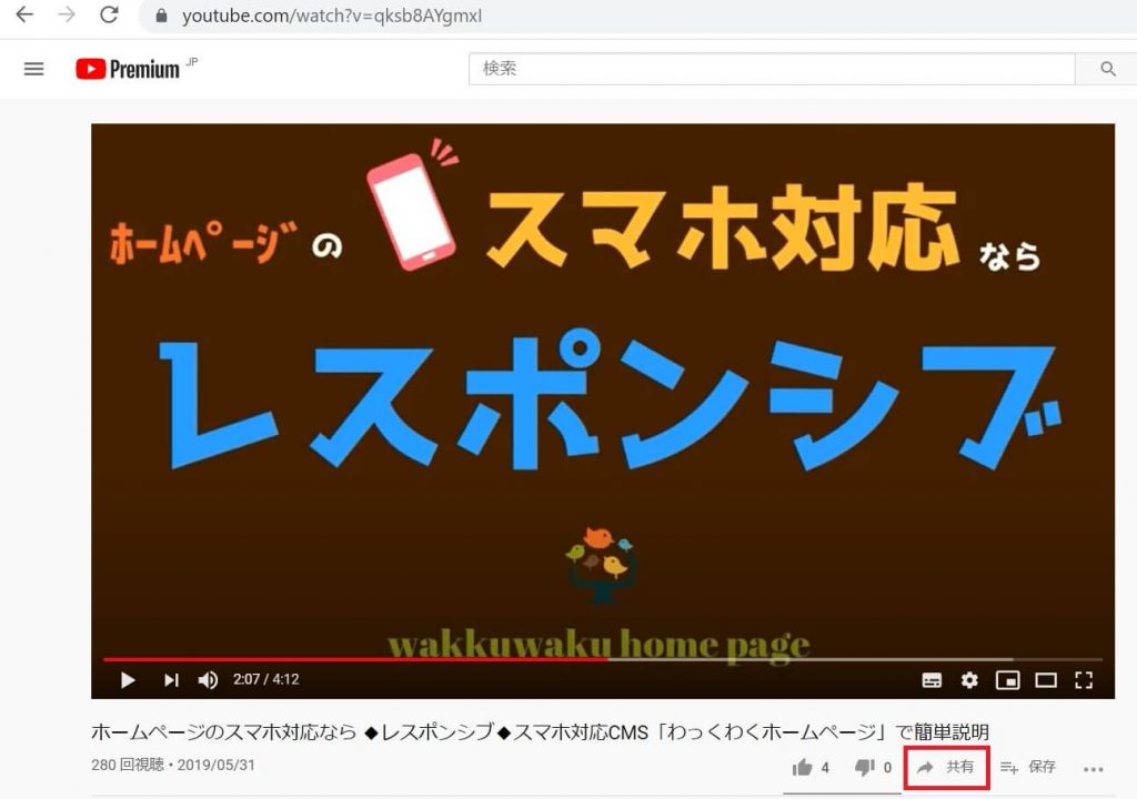 対象のYouTube動画再生画面の右下にある「共有」をクリックします。