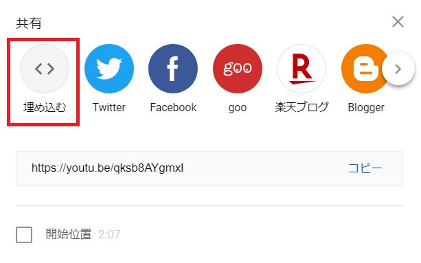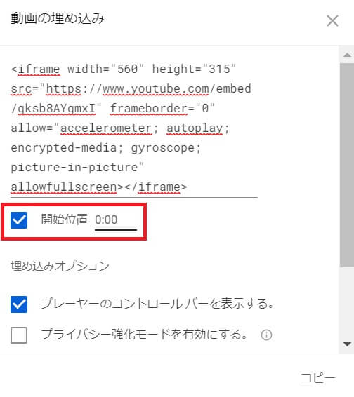埋め込みコード取得画面で、動画再生の「開始位置」を調整できます。チェックボックスにチェックを入れ、スタートさせたい動画の位置を数値で入力するだけです。この調整を行った後にコードを「コピー」して貼り付けます。