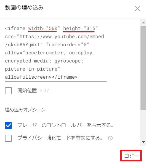 「動画の埋め込み」が表示されますので、右下にある「コピー」をクリックして、埋め込みコードをコピーします。赤線の部分が、動画の幅と高さを表しています。デフォルトでは以下の通りです。
