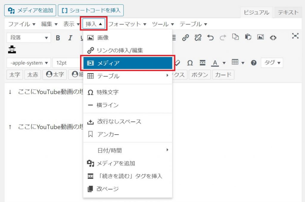 動画を埋め込みたい部分で、画像のように「挿入」から「メディア」を選択します。