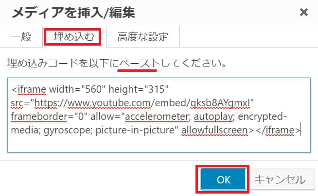 画像のような画面になるので、「埋め込む」のタグを選択し、枠内に先程コピーした埋め込みコードをそのまま貼り付けます。その後、「OK」をクリックします。