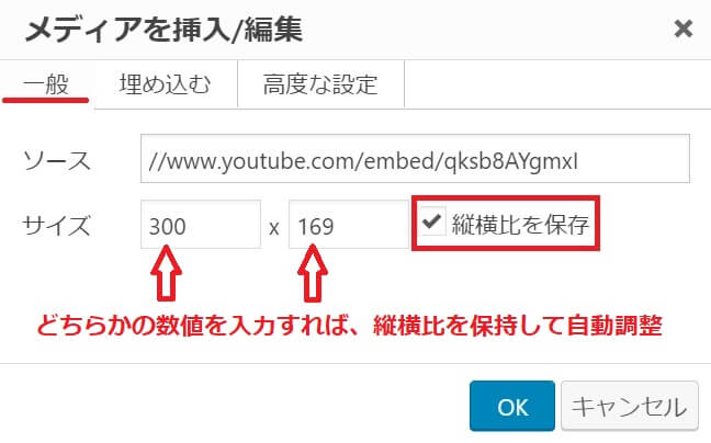 「縦横比を保存」にチェックが入っていることを確認して、希望のサイズに数字を変更します。幅か高さどちらかの数字を変更すれば、縦横比(通常16:9)を保持したまま自動調整してくれます。最後に「OK」をクリックして反映させます。